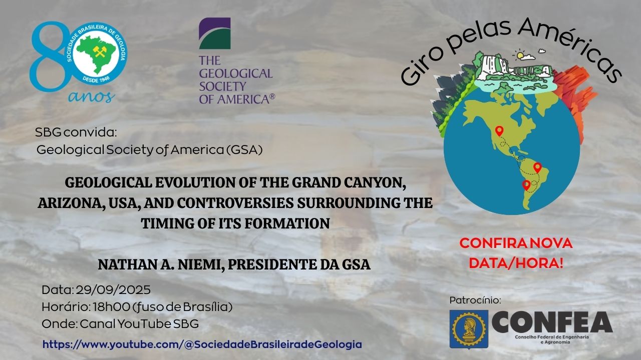 Iniciamos nossa viagem com a Geological Society of America (GSA), cuja parceria importante foi celebrada recentemente por meio de um memorando de entendimento, para realização de atividades conjuntas. O presidente da GSA, Prof. Nathan Niemi, apresentará a GSA e nos brindará com a palestra intitulada "GEOLOGICAL EVOLUTION OF THE GRAND CANYON, ARIZONA, USA, AND CONTROVERSIES SURROUNDING THE TIMING OF ITS FORMATION"