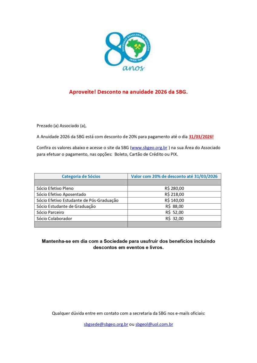 Aproveite! Anuidade 2026 da SBG com desconto.